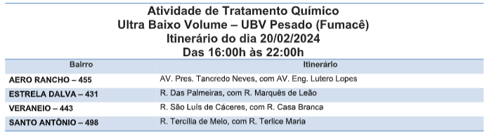 As equipes da Coordenadoria de Controle de Endemias Vetoriais (CCEV) da Secretaria Municipal de Saúde (Sesau) circularão das 16h às 22h pelas ruas dos seguintes bairros: Aero Rancho, Estrela Dalva, Jardim Veraneio e Santo Antônio.